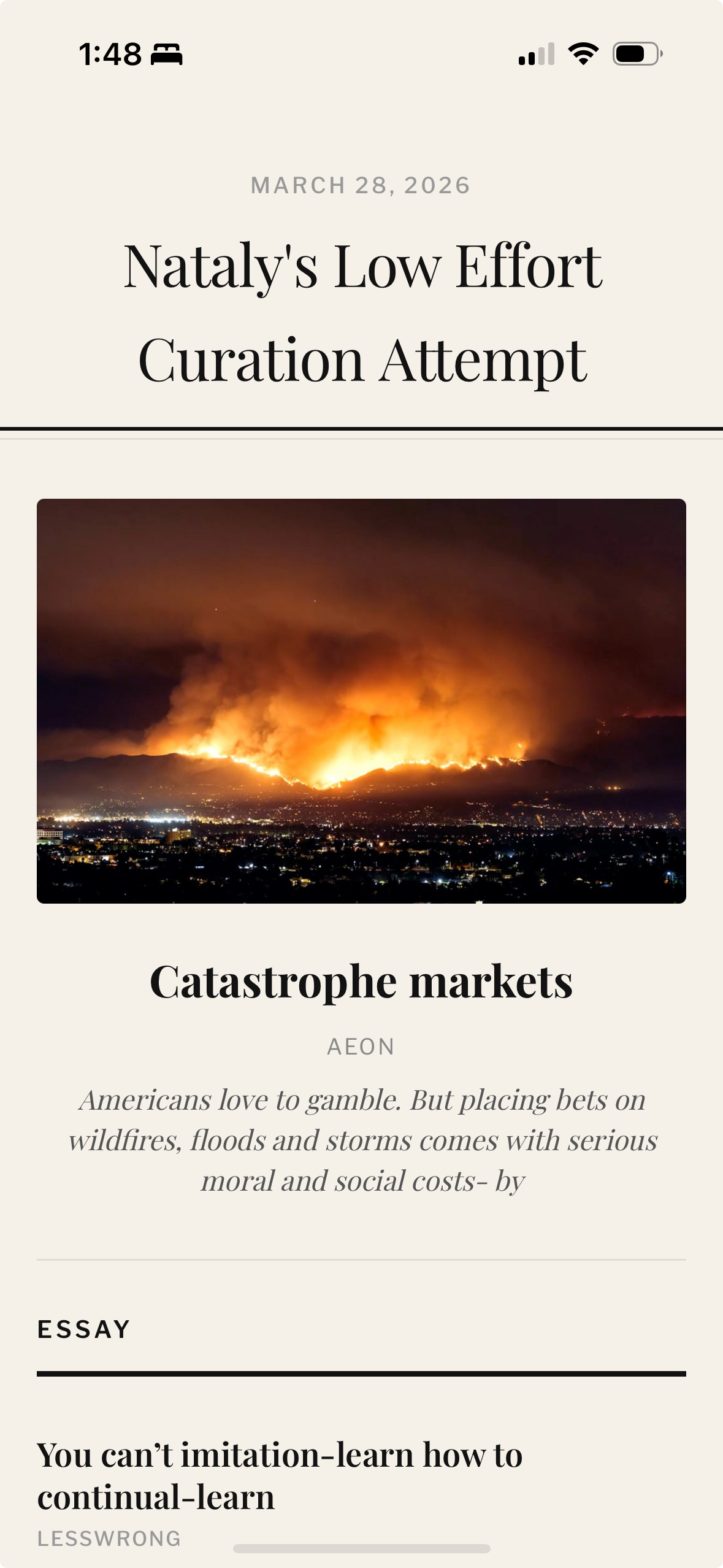 I've realized that, I unfortunately value that the editor of the New York Times carefully curated the pieces they think are important for me to read, and that I'm being spoonfed it lovingly (or maybe getting brainwashed; your thoughts on this likely depend on who you get your news from). I usually think The Times doesn't prioritize what I should be reading well, but it's mine and Joseph Kahn's way of connecting: I'm getting insight into what he cares about, and I get to start my day with an unselfish task at the get-go.